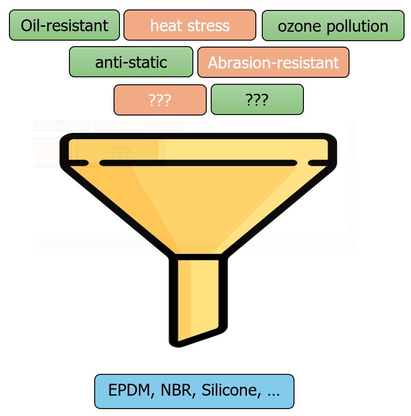Choosing the right rubber material depends on many different parameters: operating temperature, weather and ozone, contact media, dynamic load,